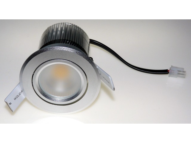 A 10 Watt Dimmable LED Downlight finished in anodised silver The complete lighting fixture is included, with LED, 90 Degree Reflector, and Transformer.
