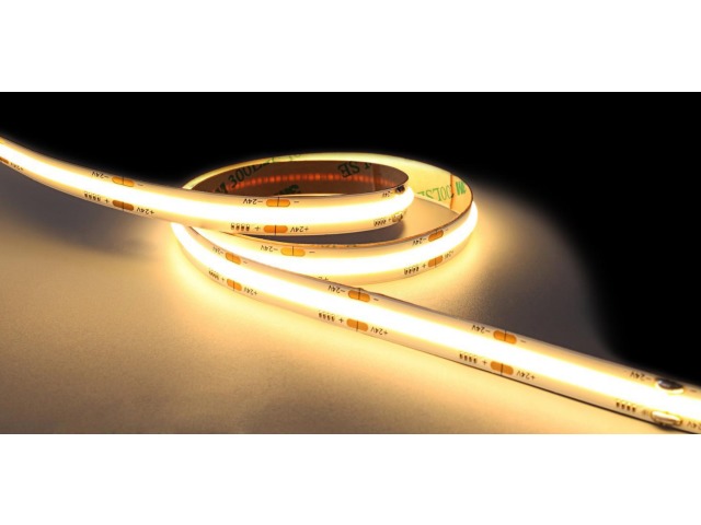 Direct view dotless COB LED Strip Lighting without a diffuser has been long sought after. It is now possible due to the high number of tiny powerful LEDs used side by side. The pitch between each LED is very close and with a Silicone coating to diffuse the light. This is our Constant Voltage COB LED Strip.