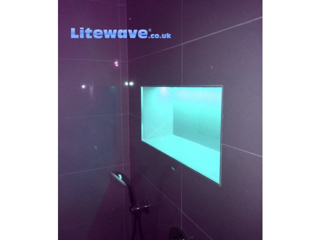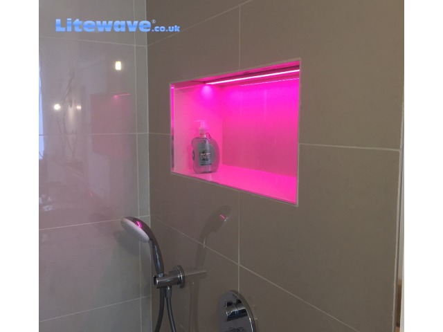 To do it right, so that it looks classy, such as you would find in the best hotels, involves a bit of forward thinking. To set a futuristic looking band of light into tiles you will need to use our Tile Profiles, these are designed to sit between a row of tiles, they can be placed vertically or horizontally. Within this profile the LED Strip is fixed into place, then the opaque cover is clipped into the profile which gives a finished appearance and also protect the LEDs from water and moisture in the air.