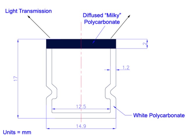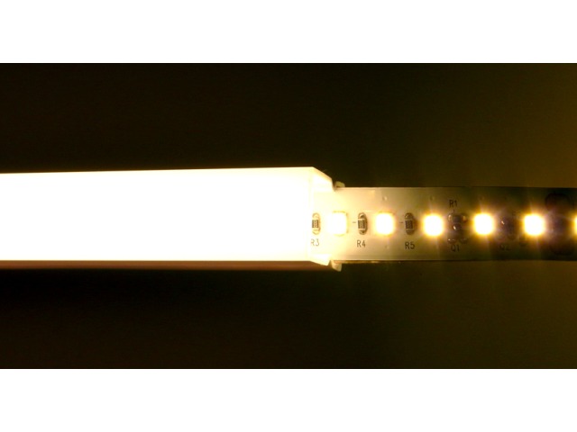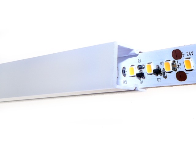 The profile is presented in an attractive gloss white finish. At first glance the profile looks like it is made of a consistent white polycarbonate but when the lights are switched on it is apparent that one side is opaque which allows the light to pass through whilst concealing the Light strip behind it.